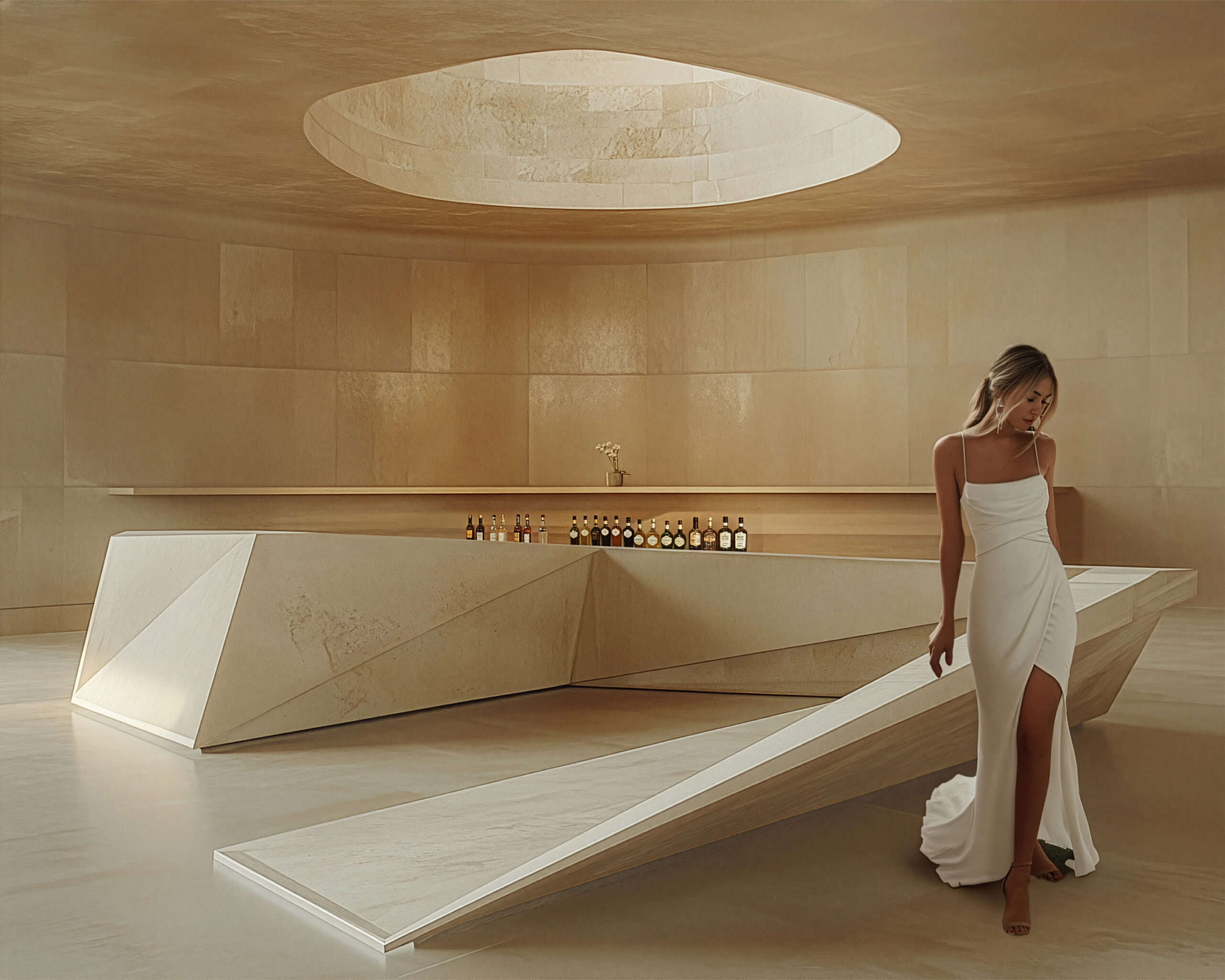 The bar can stand alone, like an island. It can also be part of a landscape formation in an indoor or outdoor space (e.g. in a lobby, terminal, fair, etc.), or create its own enclosed, cave-like interior space.