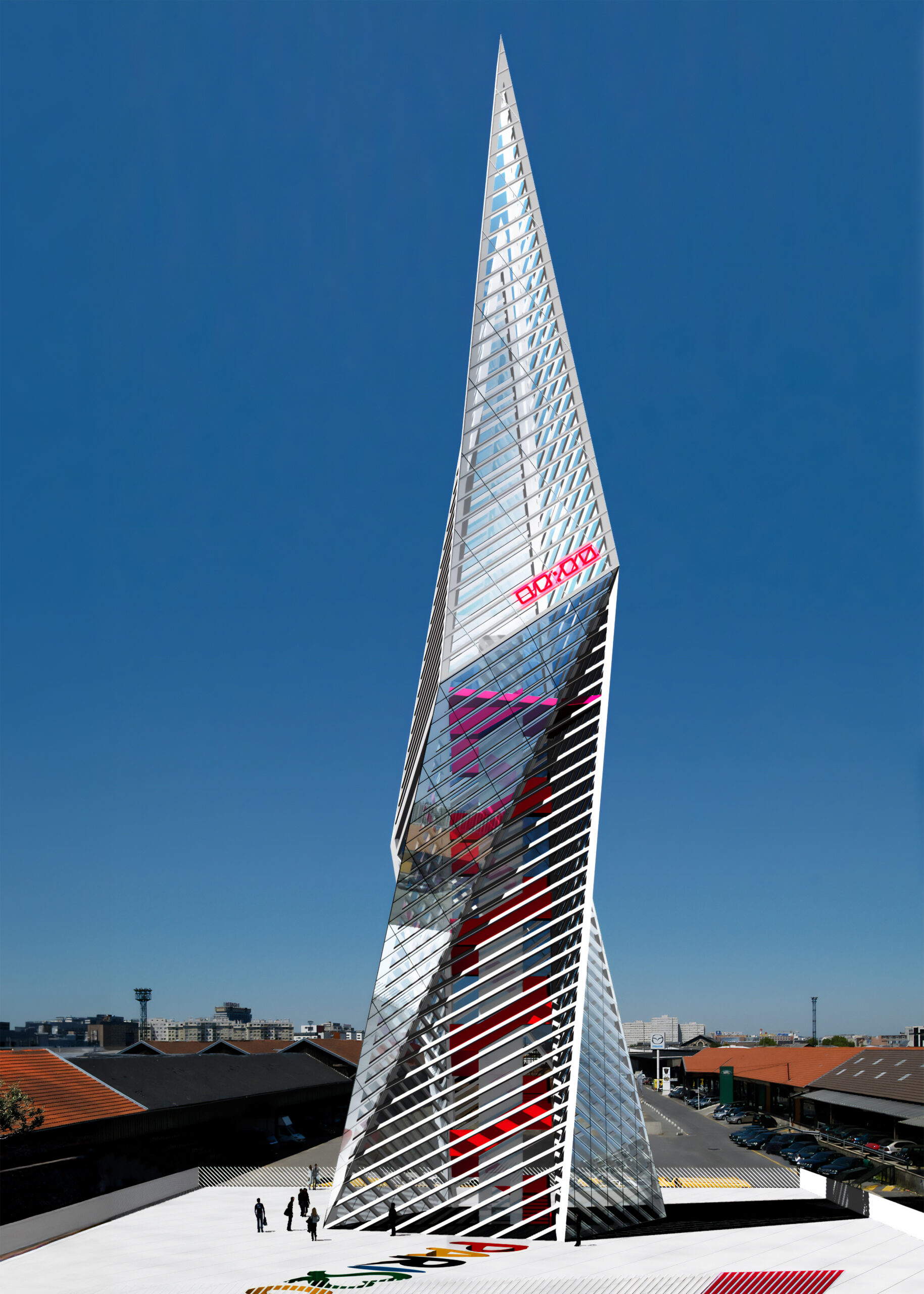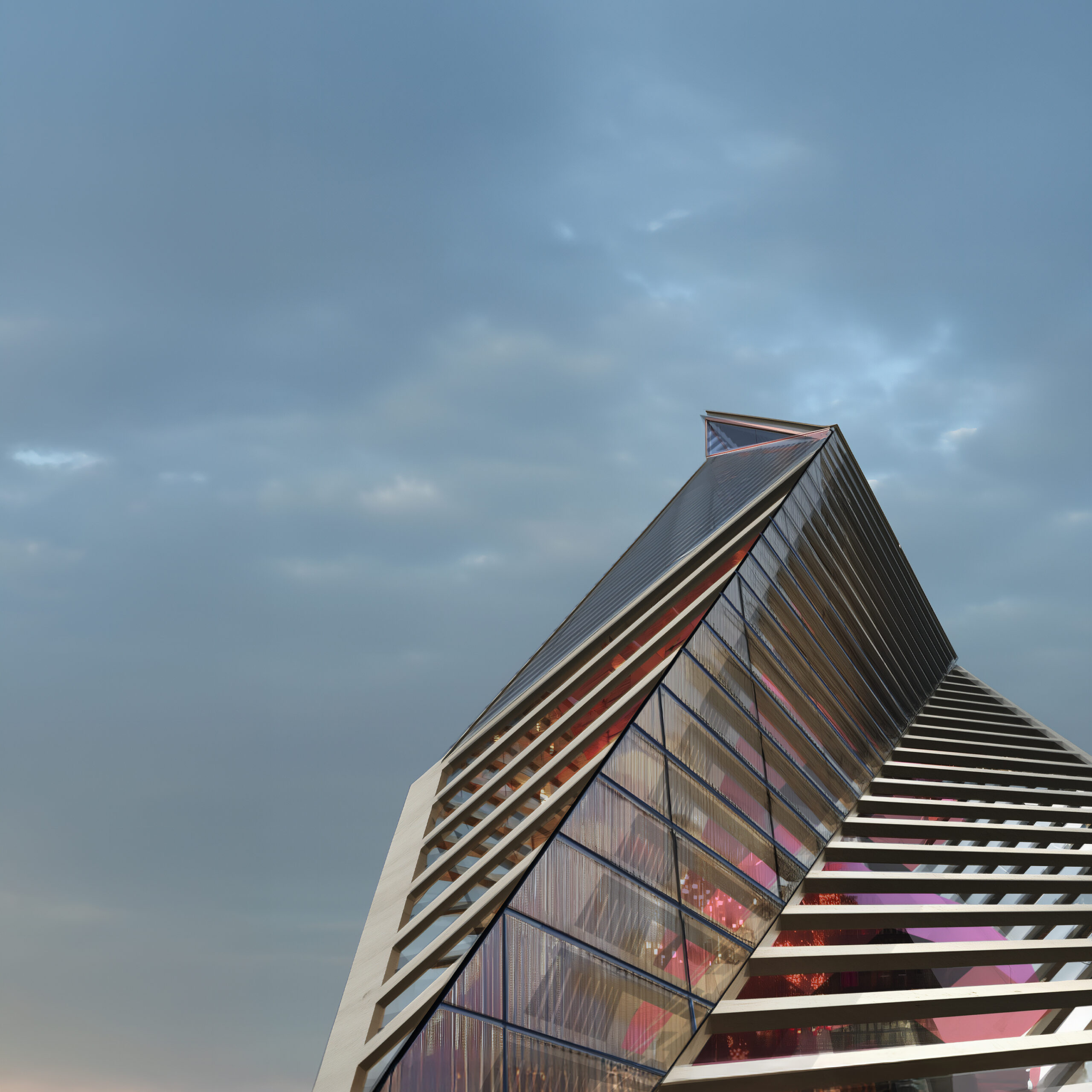Upon entry visitors have a clear route through the orientation but they are at the same time steered onto a more circuitous route through the garden / urban living room. The light applied to the landmark’s complex surface plays off reflection and transparency shifts as one moves towards it. The approach is epitomised by the use of metal red sheets that wrap around the landmark’s semi enclosed core, along the staircase’s side and shoot up taking visitors to the maximum accessible height of twenty-eight metres.