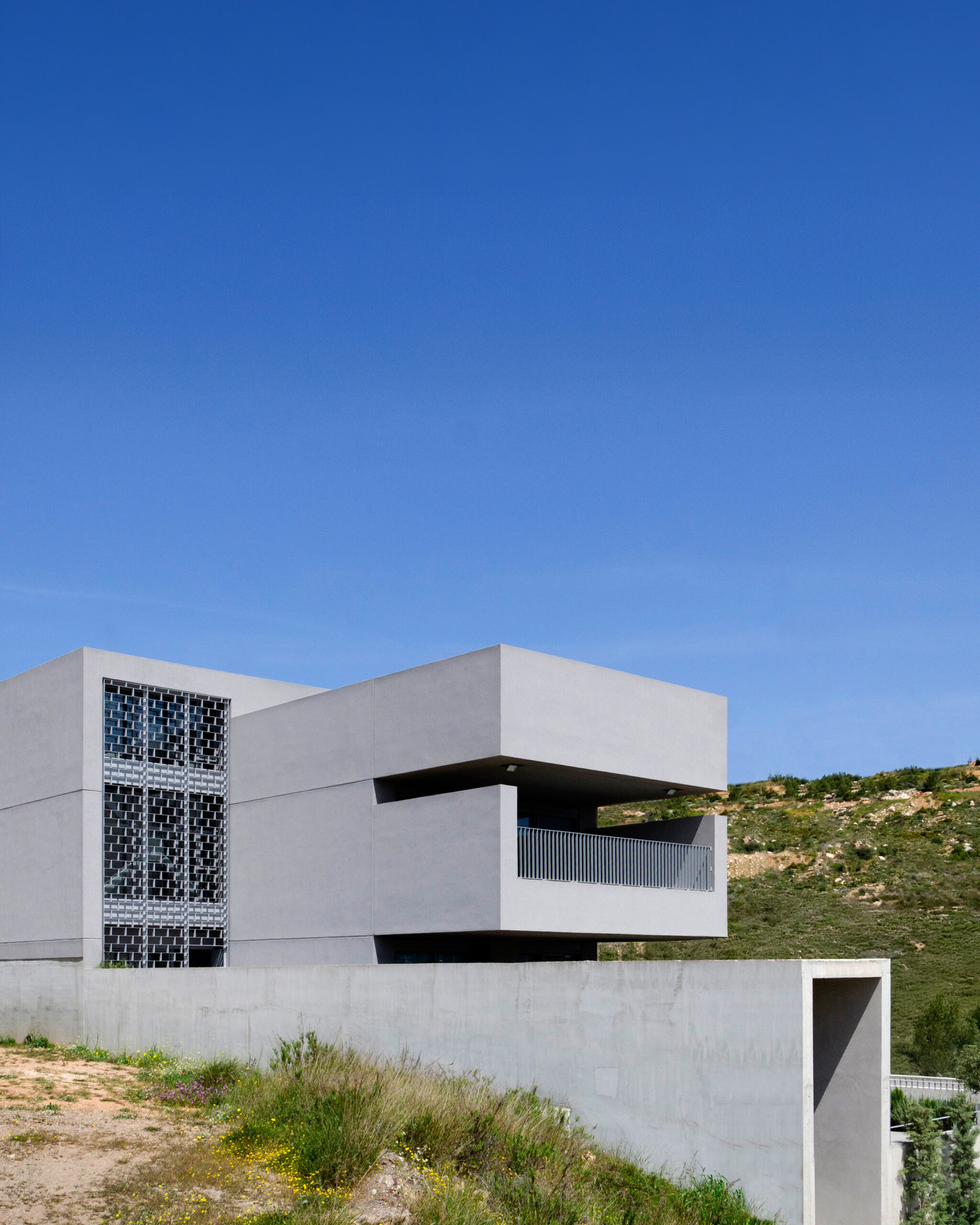 This project is a matter of perspective! It is about vistas and framed views. Just like a figurative artist would identify the subject and frame it within the painting, the house is designed to impose certain vistas and block others. Focusing on the distant horizon, it prohibits the viewing of anything located in its vicinity. The buildings scattered in this low-density suburban area near Athens form a fabric typical of the city itself. Beautiful from afar, ugly in proximity. Bulk cantilevered walls dominate the building’s facade, forming the shell of a dioptre, or periscope, targeting specific distant vistas with indifference to the building’s immediate context.
