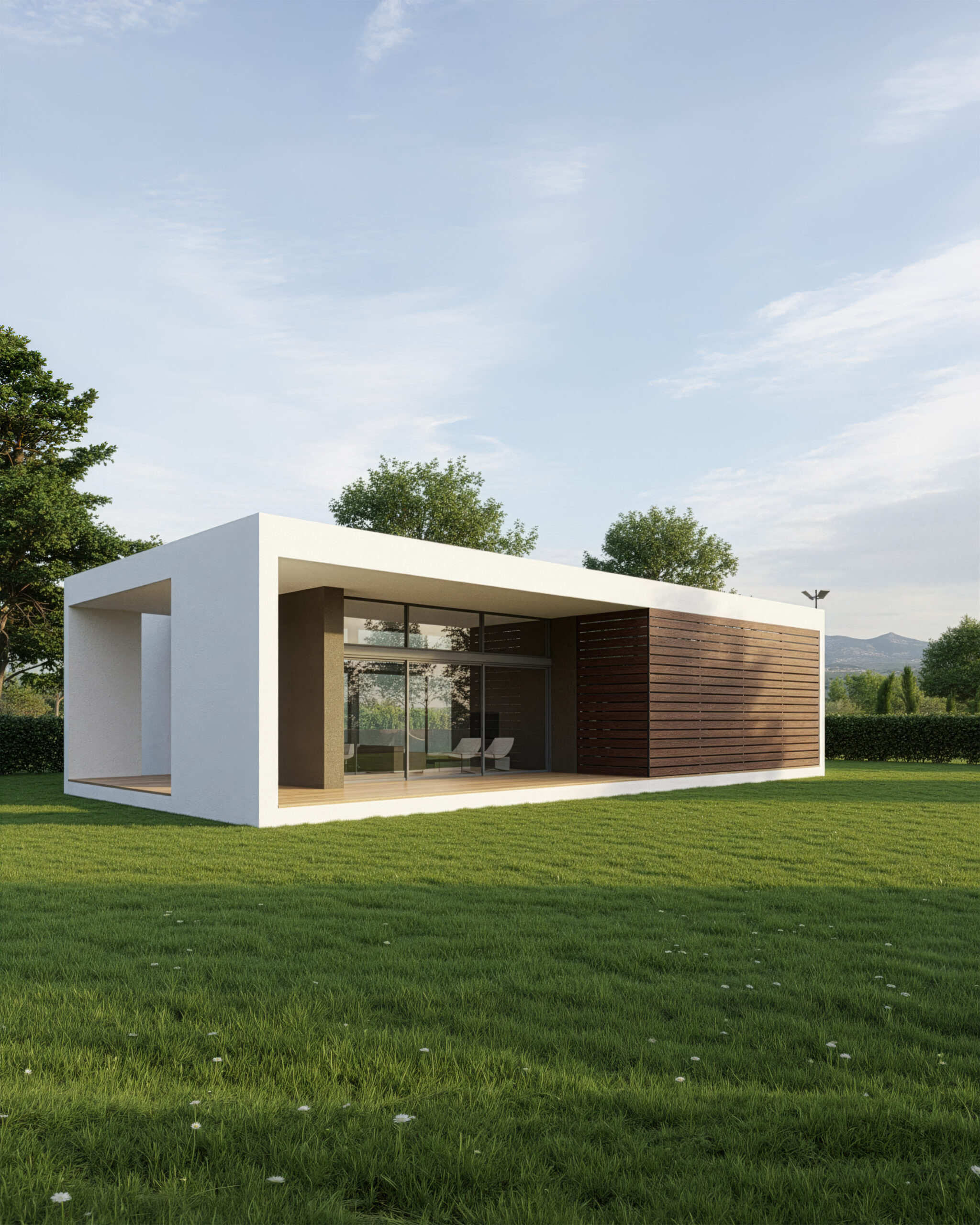A restrained composition of white rendered volumes, timber screening, and deep recesses creates a sheltered, light-filled retreat that mediates between interior living and the surrounding landscape.