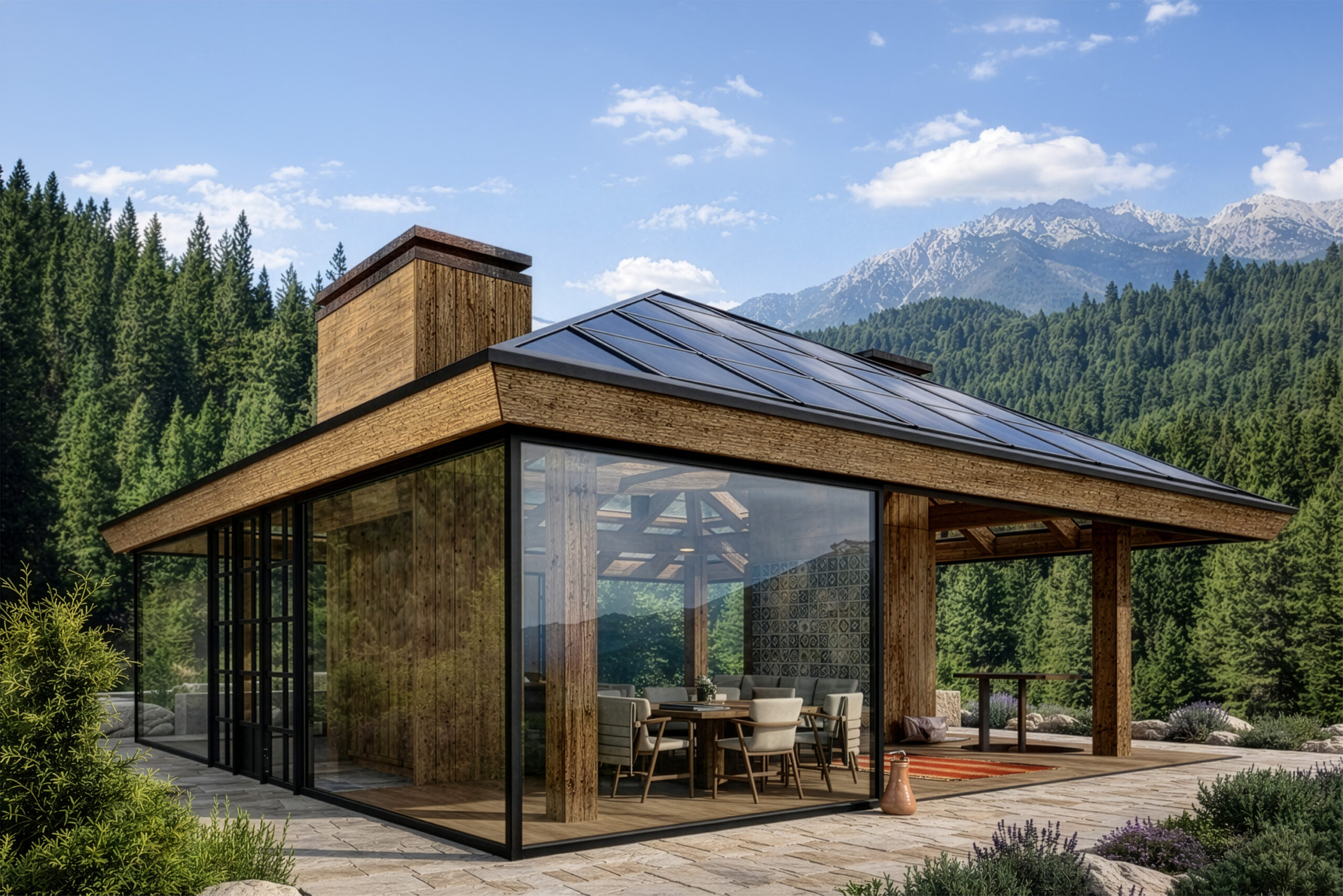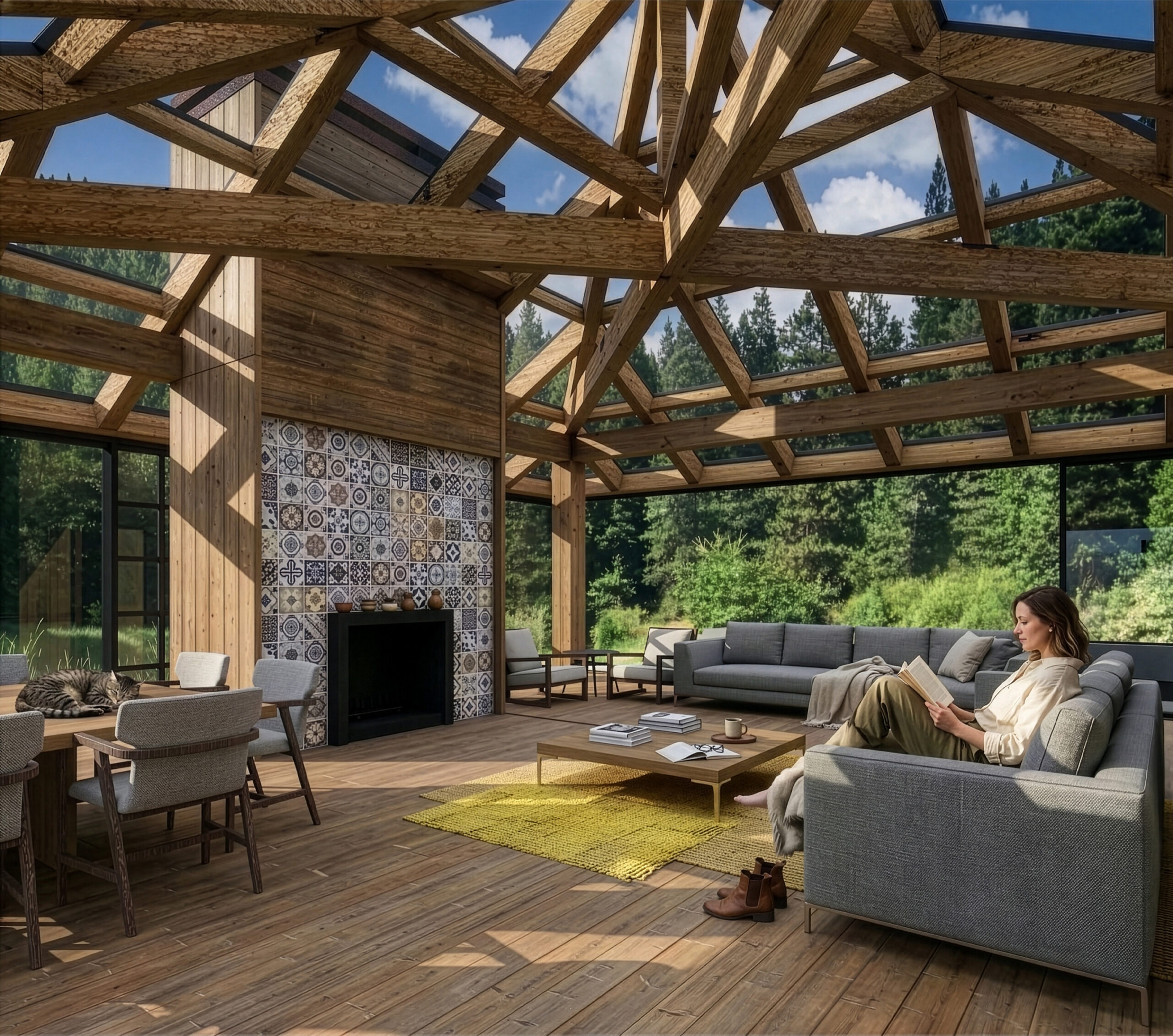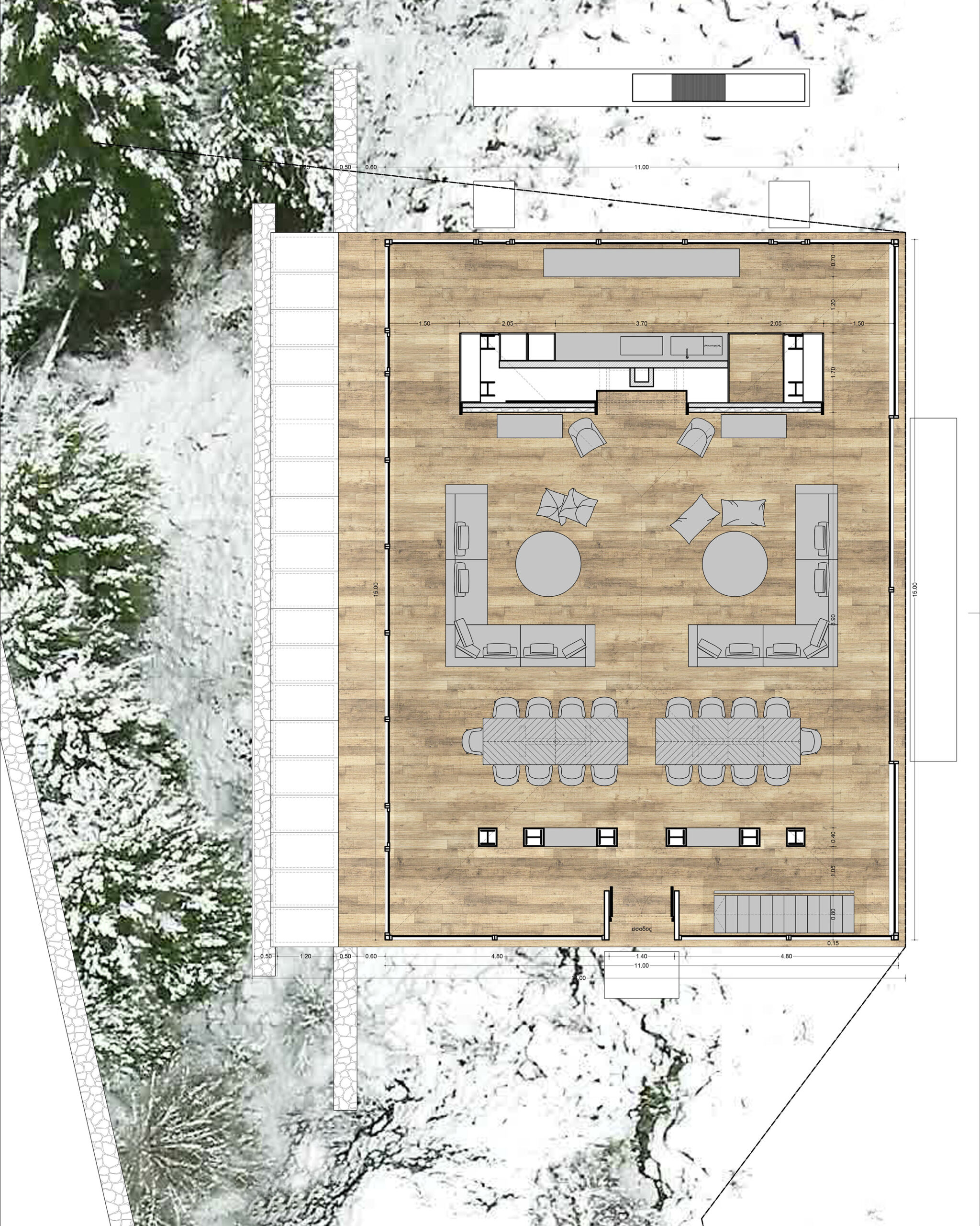 Set on the slopes of Mount Parnassus, this guest house is designed as a light-filled refuge immersed in the forest. The shared living spaces occupy the upper level, while the bedrooms are placed below, allowing the main floor to fully engage with the view. Generous glazing defines the architecture, dissolving the boundary between inside and outside and framing the surrounding landscape as a living backdrop. The house becomes both shelter and observatory, shaped by light, transparency, and the changing beauty of the mountain setting.