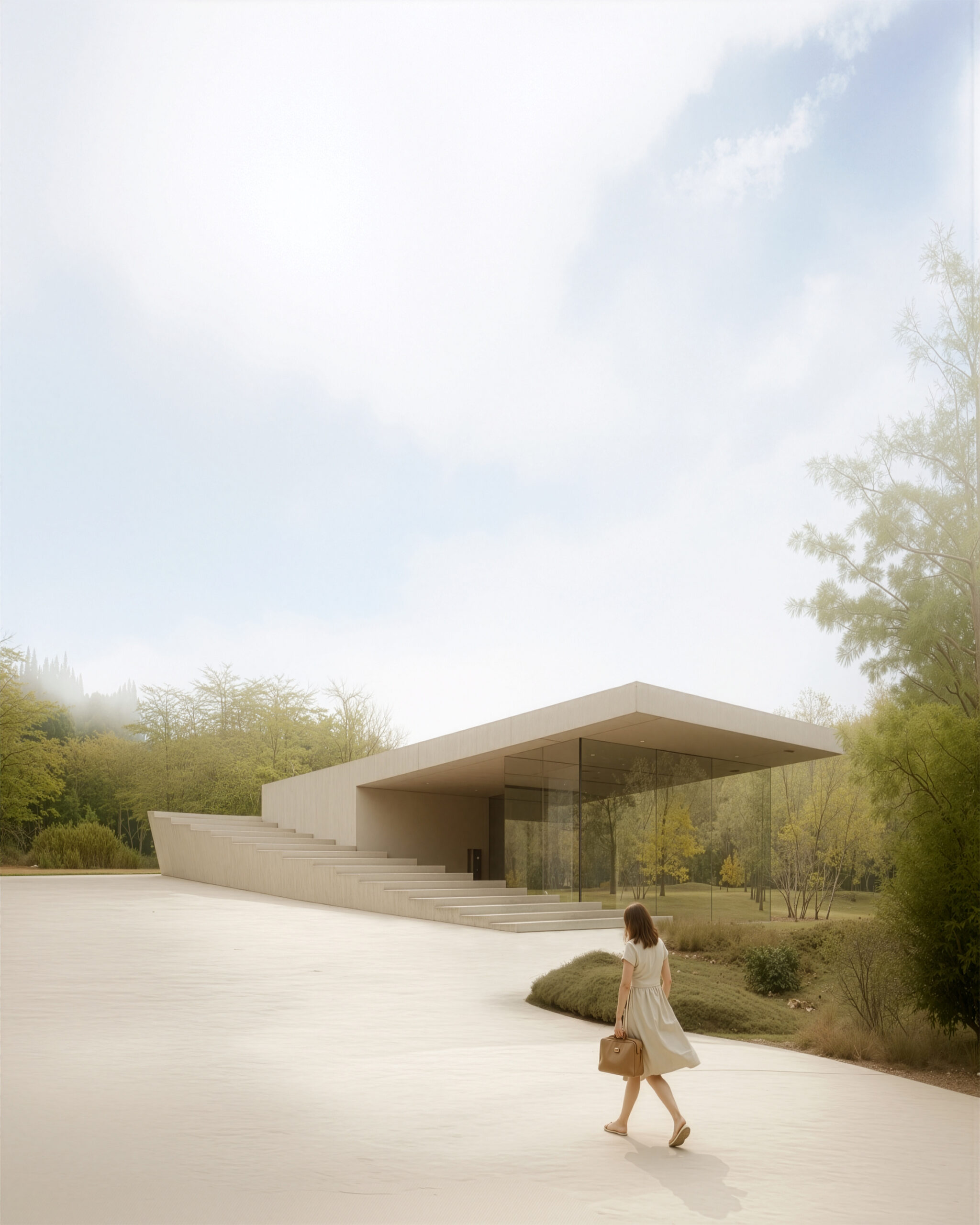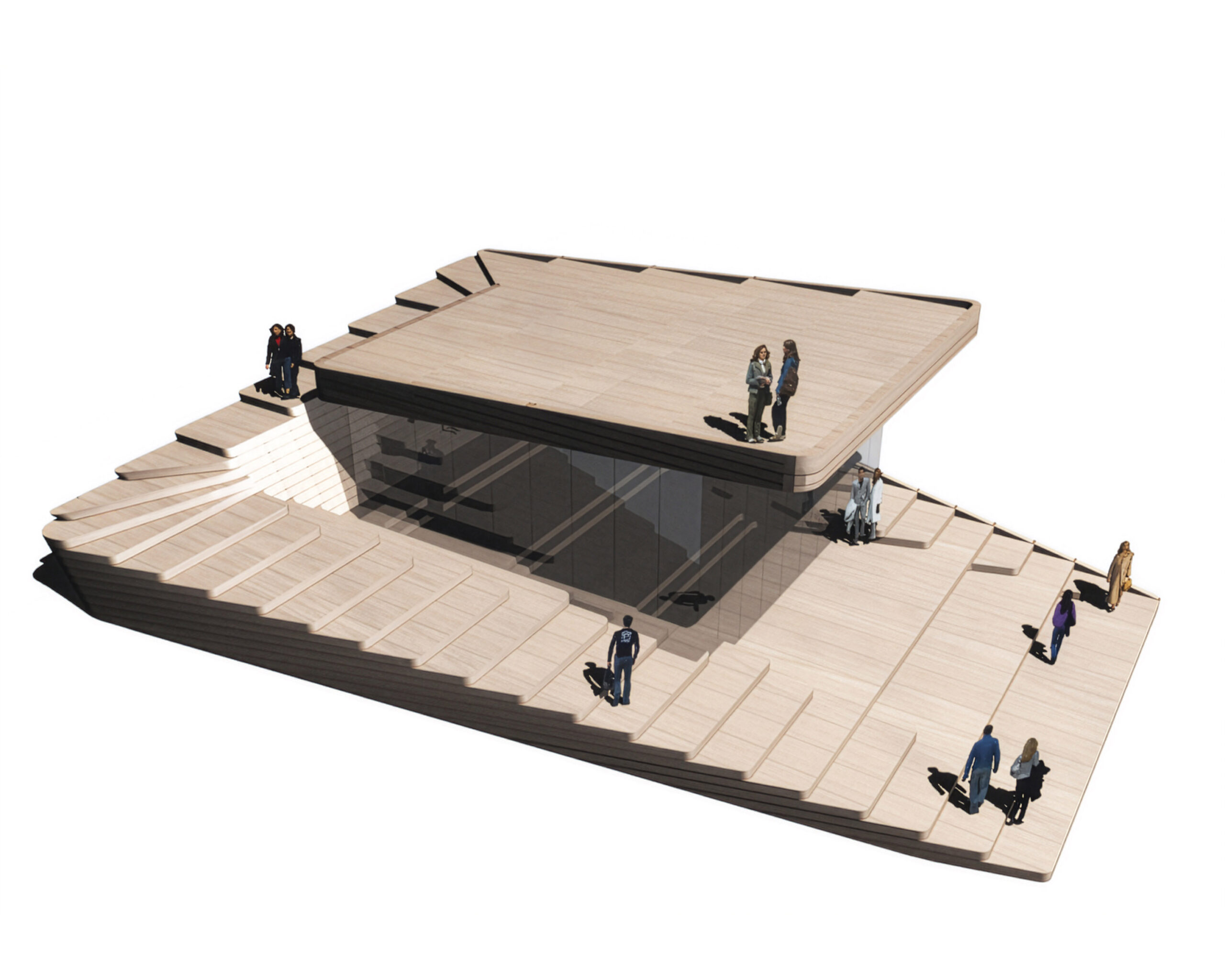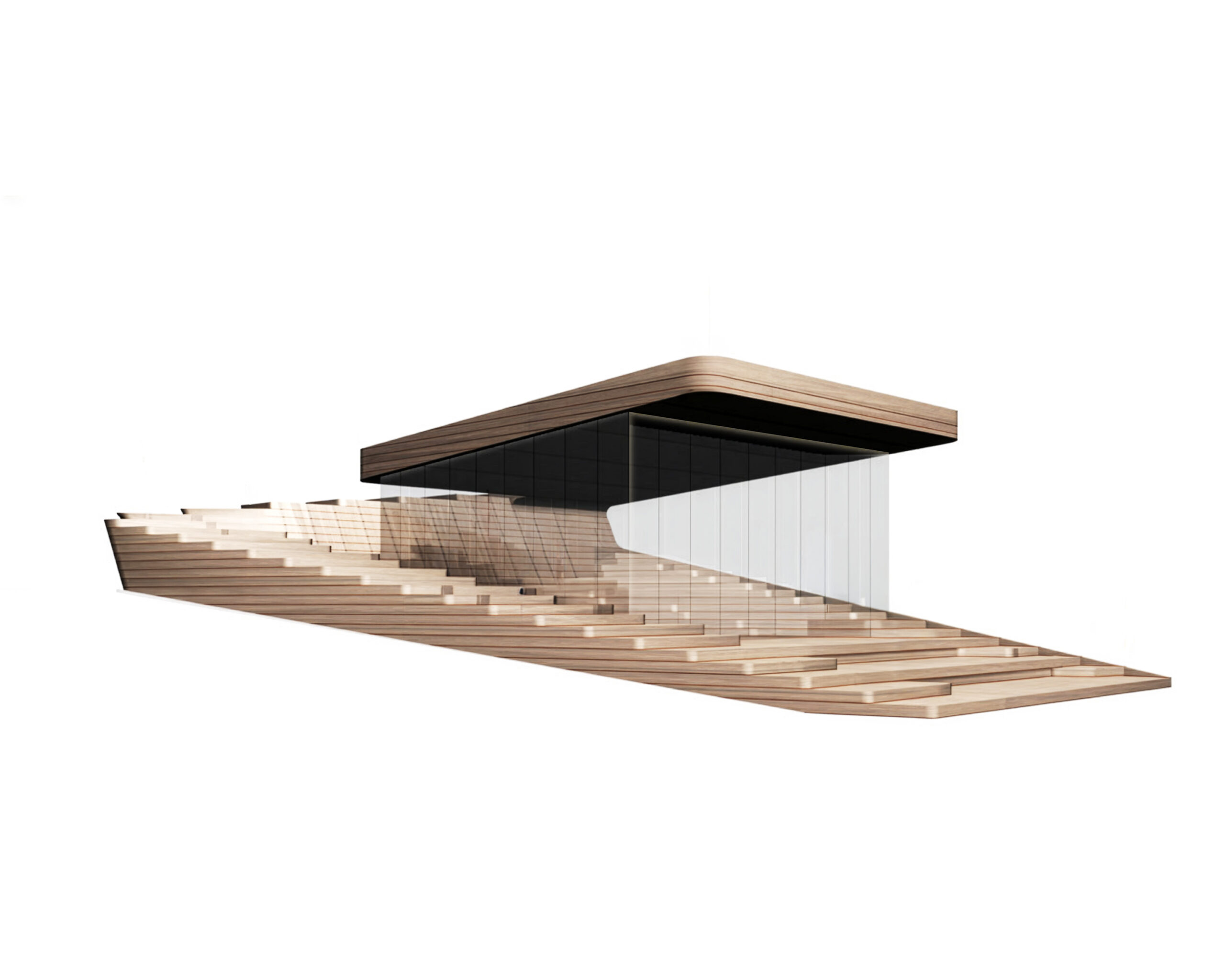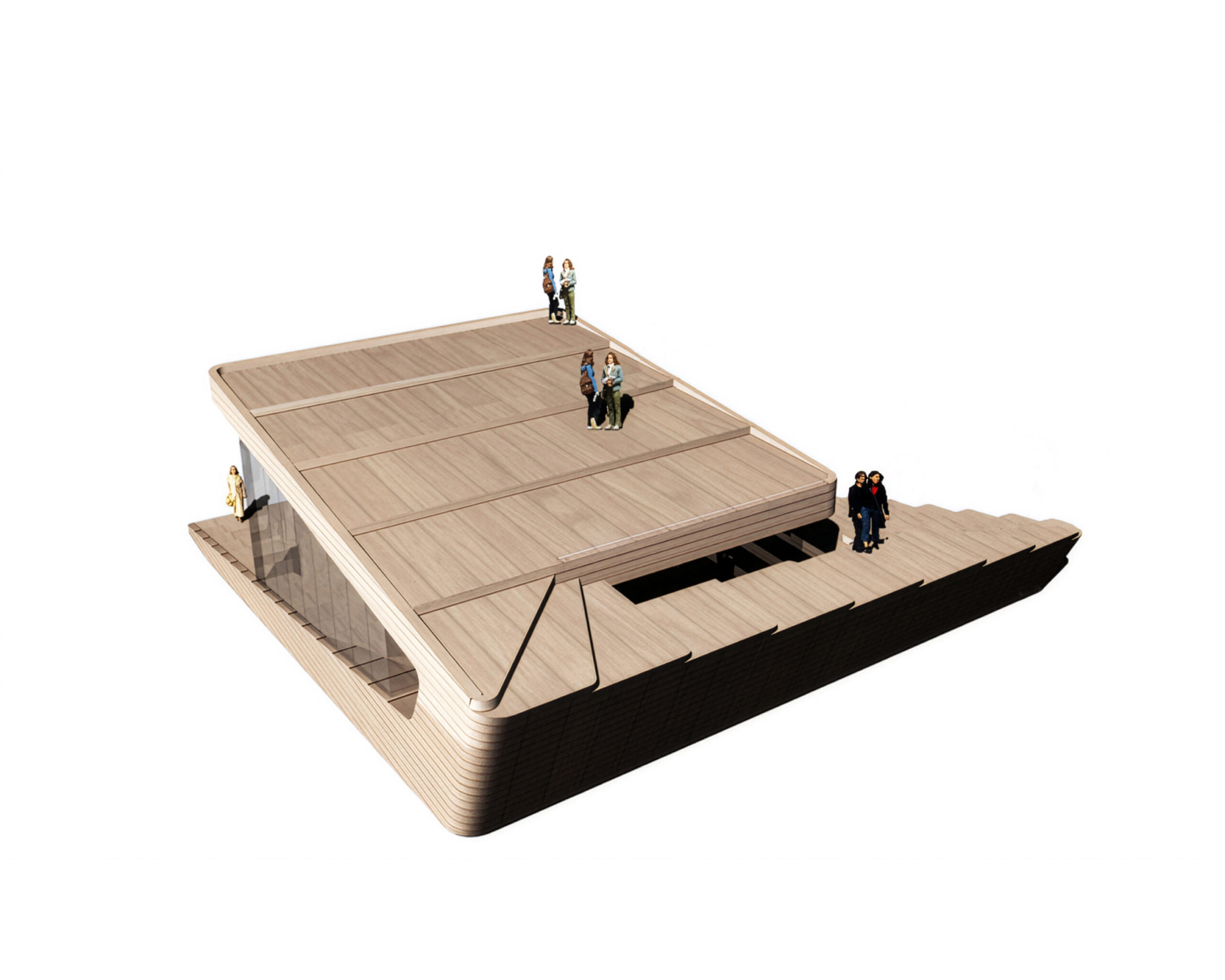 Its amphitheatrical roof, walkable and open to the elements, transforms exhibition into event. A fleeting architecture, it celebrates the choreography of movement, gathering, and retreat.